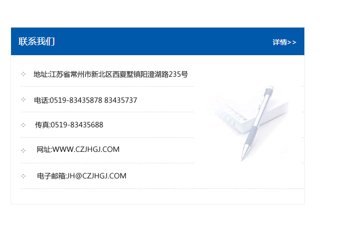 傳真:0519-83435688    郵編:213135    網址:WWW.czjhgj_com.xianglong168.com    電子郵箱:JH@czjhgj_com.xianglong168.com